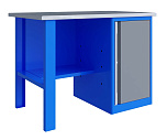 Однотумбовый. Допустимая нагрузка на столешницу 750 кг. Опорные элементы выполнены сварными из холоднокатаной стали. Верстак состоит из опоры, тумбы P7 с дверью и двумя полками и полки-стенки. Все металлические элементы покрыты полиэфирной порошковой краской. Столешница состоит из фанеры марки ФСФ толщиной 24 мм, которая покрыта лаком-антисептиком и листом оцинкованной холоднокатаной стали толщиной 1,2 мм. Размеры (ВхШхГ) 855x1196x696 мм.