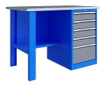 Однотумбовый. Допустимая нагрузка на столешницу 750 кг. Опорные элементы выполнены сварными из холоднокатаной стали. Верстак состоит из столешницы, опоры, тумбы P5 с четырьмя малыми и одним большим ящиком и полки-стенки. Все металлические элементы покрыты полиэфирной порошковой краской. Столешница состоит из фанеры марки ФСФ толщиной 24 мм, которая покрыта лаком-антисептиком и листом оцинкованной холоднокатаной стали толщиной 1,2 мм. Размеры (ВхШхГ) 855x1396x696 мм.