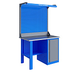 Однотумбовый. Допустимая нагрузка на столешницу 750 кг. Опорные элементы выполнены сварными из холоднокатаной стали. Верстак состоит из столешницы,опоры, тумбы P7 с дверью, полки-стенки, двойного экрана с кронштейнами и комплекта освещения. Все металлические элементы покрыты полиэфирной порошковой краской. Столешница состоит из фанеры марки ФСФ толщиной 24 мм, которая покрыта лаком-антисептиком и листом оцинкованной холоднокатаной стали толщиной 1,2 мм. Размеры (ВхШхГ) 1965x1196x696 мм.