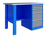 Верстак однотумбовый поставляется в разобранном виде. Нагрузка на столешницу до 600 кг. Стандартный цвет: корпус - серый глянец RAL 7030, ящики и двери тумб - синий RAL 5017. Размеры:855x1400x700 мм. Вес: 86 кг.