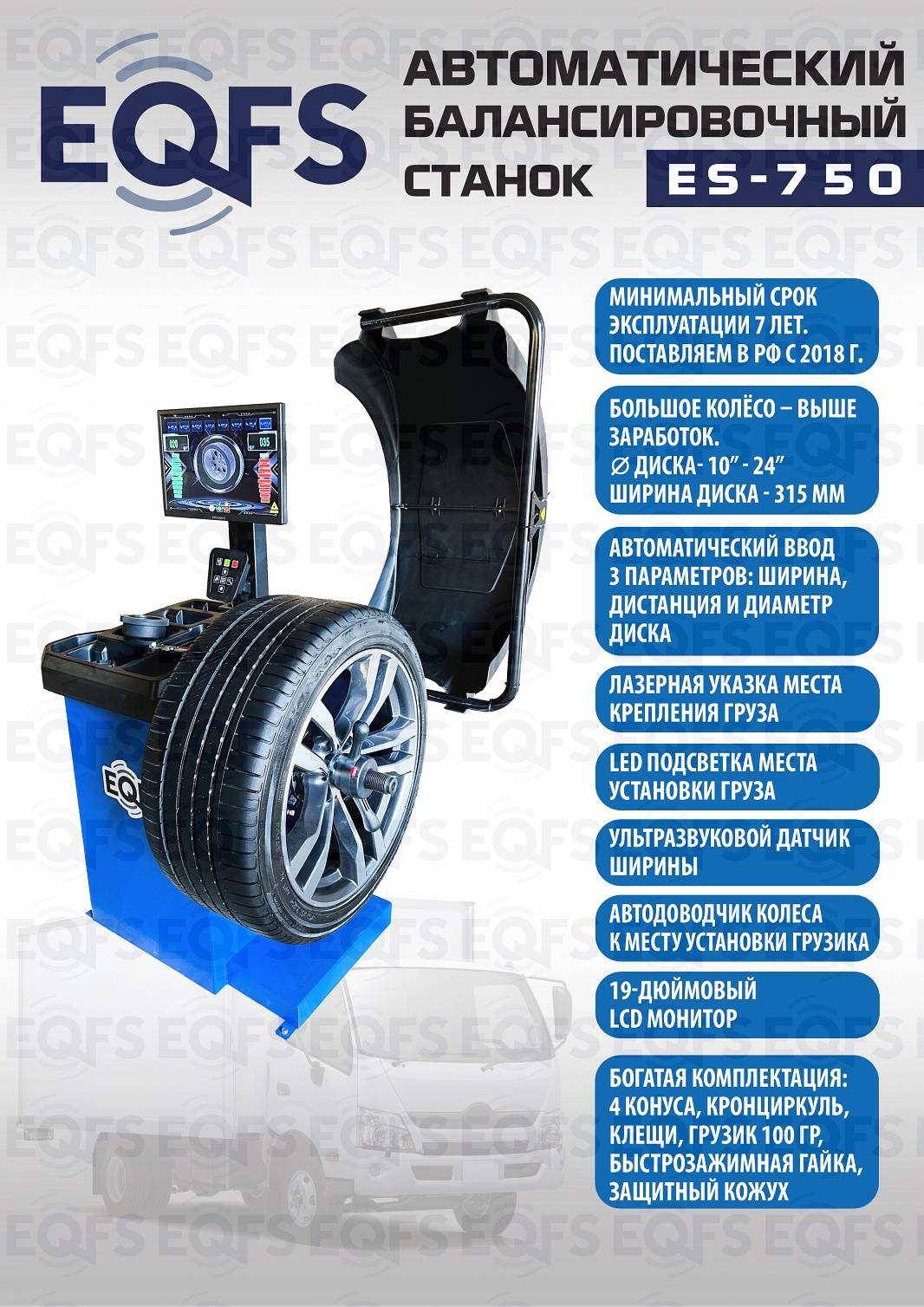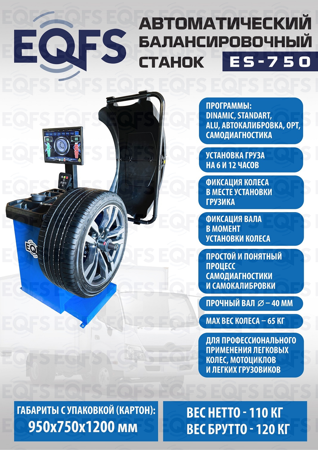 ES-750 Автоматический балансировочный станок. Автодоводчик и лазерная указка места установки грузика. Автоматический ввод 3-х параметров. Для колёс шириной 315мм, Ø до 800мм и весом до 65кг. Диски ширина 3–10” (76-254 мм) , диаметр 10–24” (254÷609 мм) Программы: статическия и динамическая балансировка, ALU, OPT, SPLIT, калибровка и самодиагностика. LCD монитор 19 дюймов. Вал Ø - 40мм. Для балансировки колёс легковых автомобилей, мотоциклов, лёгких грузовиков и широких колёс. Гарантия 18 мес – наш монтаж, 12 мес – самостоятельная установка.