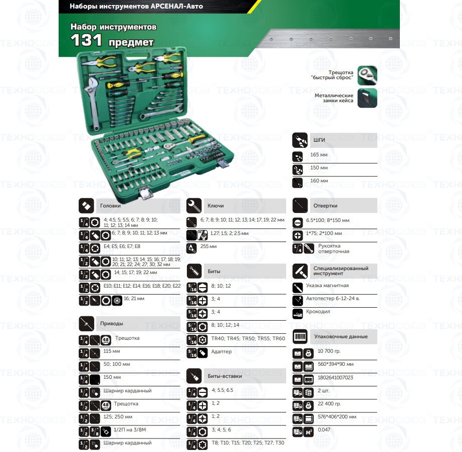 Набор инструментов 131 предмет auto Арсенал AA-C1412P131 создан с учетом запросов профессионалов в области ремонта и обслуживания авто специально для российского рынка. Содержит большое количество бит и бит-вставок. Инструмент изготовлен из стали, легированной хромом и ванадием, с финишным никелевым покрытием. Кейс выполнен из особопрочной пластмассы, позволяет удобно хранить и транспортировать инструмент. На все наборы инструментов Арсенал распространяется пожизненная гарантия. Инструмент Арсенал - Специально разработан для Российских условий!!!