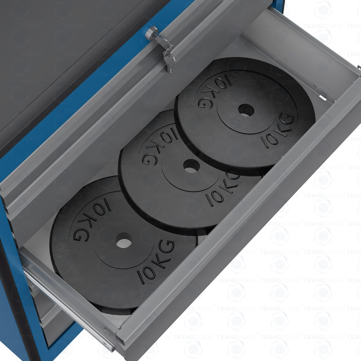 Все металлические элементы тележки покрыты полиэфирной порошковой краской, обеспечивающей хорошую износостойкость покрытия и стойкость его к моющим средствам и смазочным веществам. Цвет и текстура покрытия корпуса тележки RAL 5015, полуматовое. Цвет и текстура покрытия ящиков тележки RAL 7037, глянцевое. Цвет и текстура покрытия накладок на ящики RAL 9006, глянцевое.  На крыше тележки установлен формованный лоток, выполненный из АБС-пластика толщиной 2 мм. В лотке имеется одно большое основное отделение и три малых отделения для хранения метизов и небольшого инструмента.  Тележка снабжена центральным замком с поворотом ригеля 180 градусов, который закрывает одновременно все ящики. Замок неподвижно и прочно закреплен на корпусе тележки. В комплекте имеется два ключа. Тяга замка подпружинена.