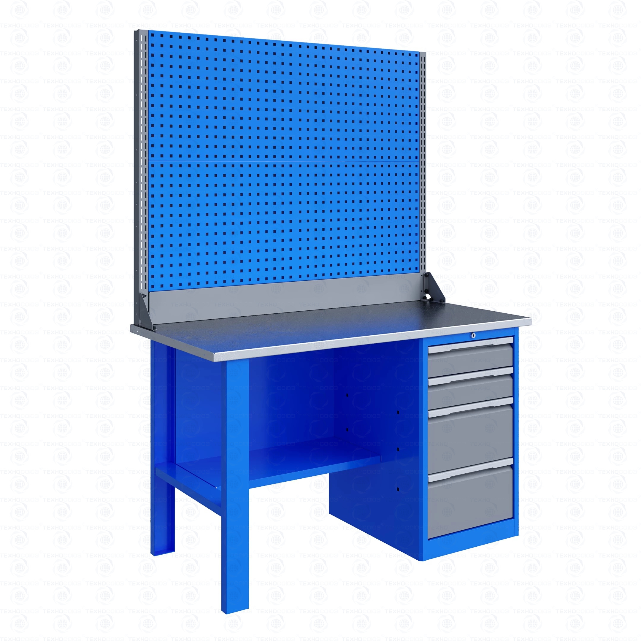 Тумба верстака - сварная. Ящики в тумбе устанавливаются на шариковых телескопических направляющих полного выдвижения. В тумбе P4 установлено два малых и два больших ящика. Внутренние размеры малых ящиков (ВхШхГ), не более: 103 х 397 х 520 мм. Внутренние размеры больших ящиков (ВхШхГ), не более: 222 х 397 х 520 мм. Тумбы с ящиками снабжены общим центральным замком с поворотом ригеля 180 градусов и подпружиненной тягой. В комплекте два ключа.